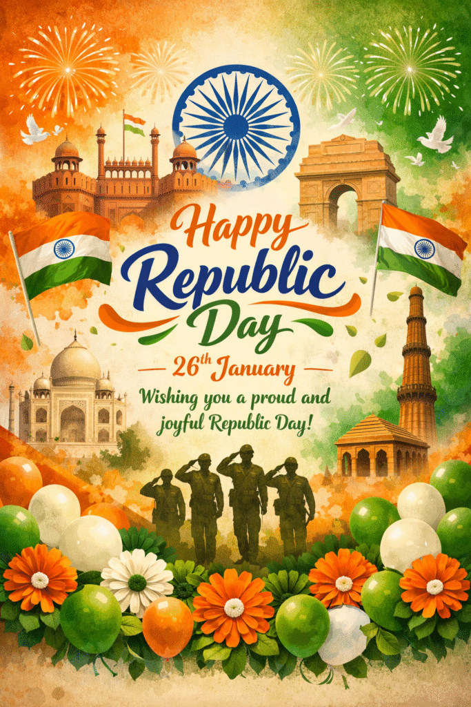 India’s Republic Day, celebrated every year on 26 January, is one of the most important national festivals of our country. This day marks the adoption of the Indian Constitution and symbolizes unity, freedom, and patriotism. On this proud occasion, people across India share greetings, messages, and visuals to express their love for the nation. One of the most popular ways to do this today is by sharing an India Republic Day wishes card online.